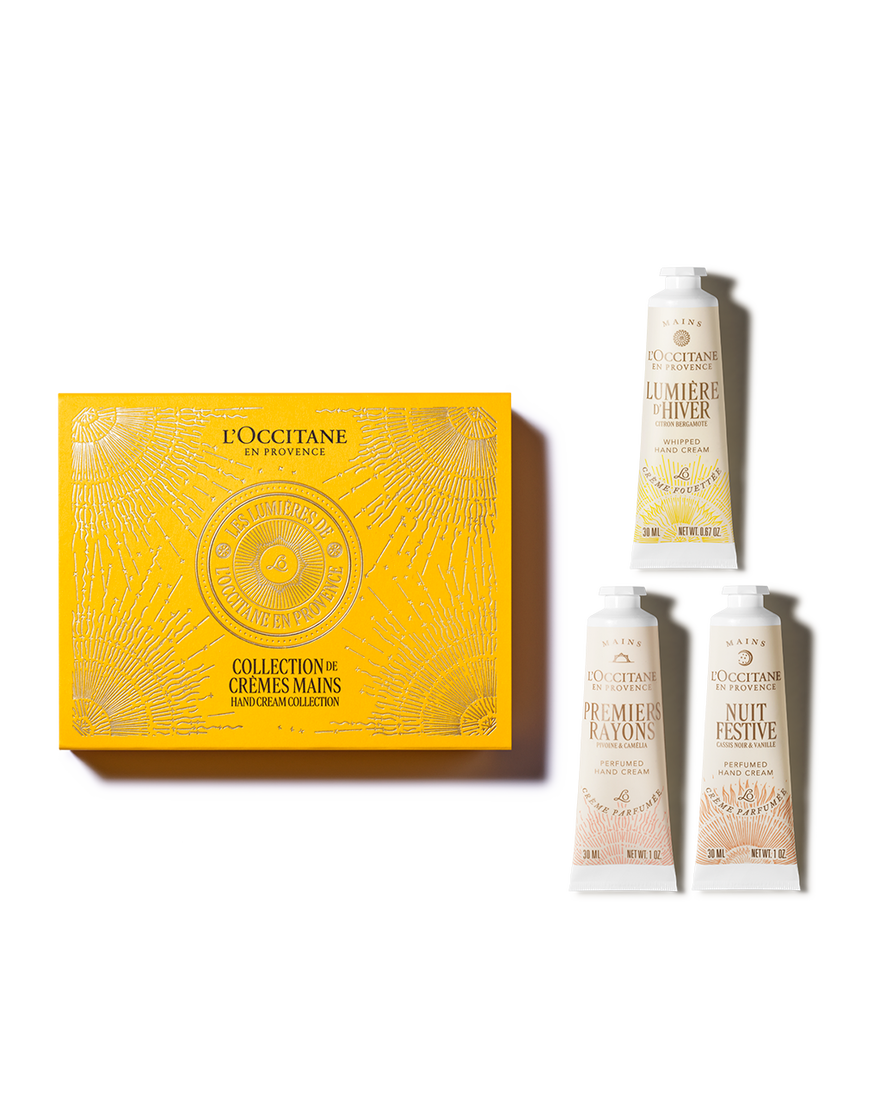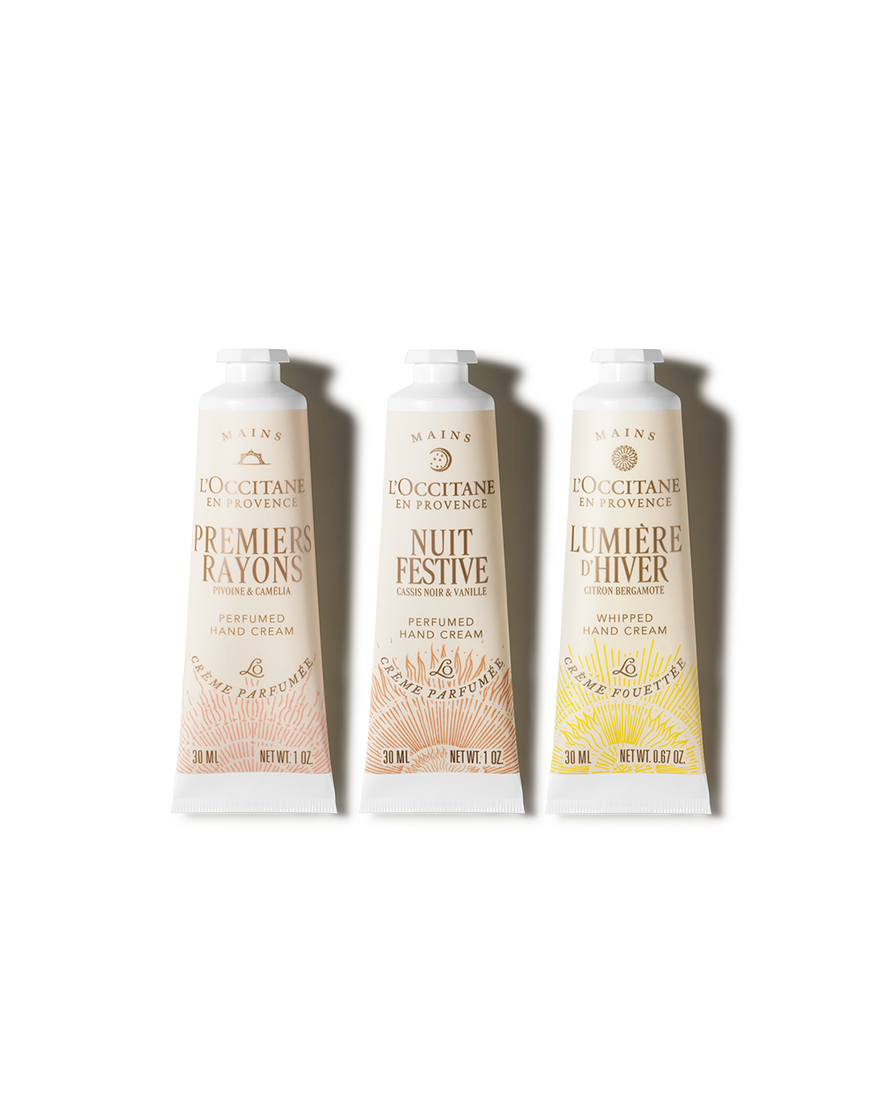 Le coffret comprend trois crèmes mains en édition limitée : Lumière d’Hiver, Nuit Festive et Premiers Rayons. Trois ambiances parfumées pour accompagner chaque instant — parfait pour offrir, ou pour s’offrir un rituel beauté complet et lumineux pendant la saison des fêtes.